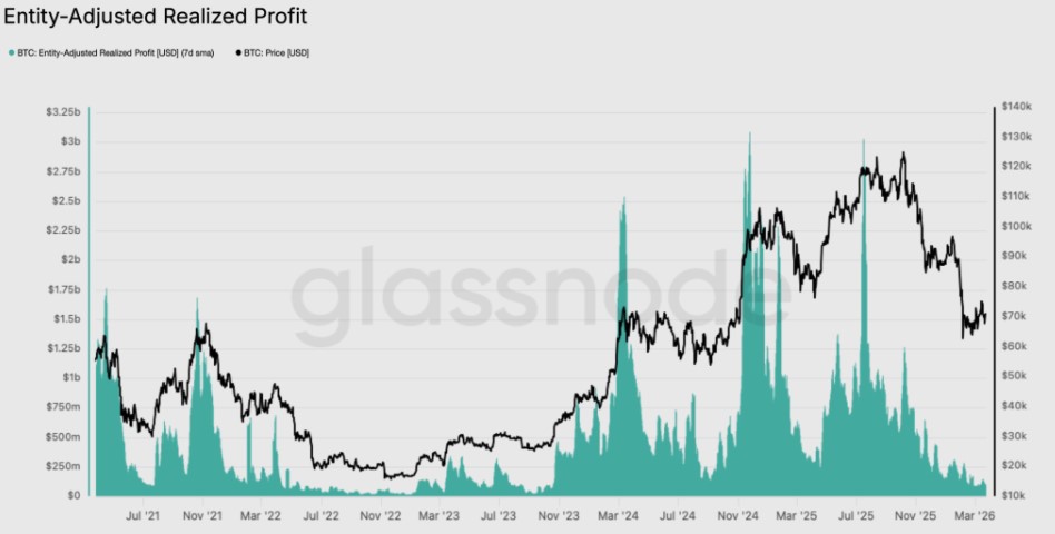 比特币经实体调整后的已实现利润也从2025年7月的每日30亿美元高点降至目前不到1亿美元。