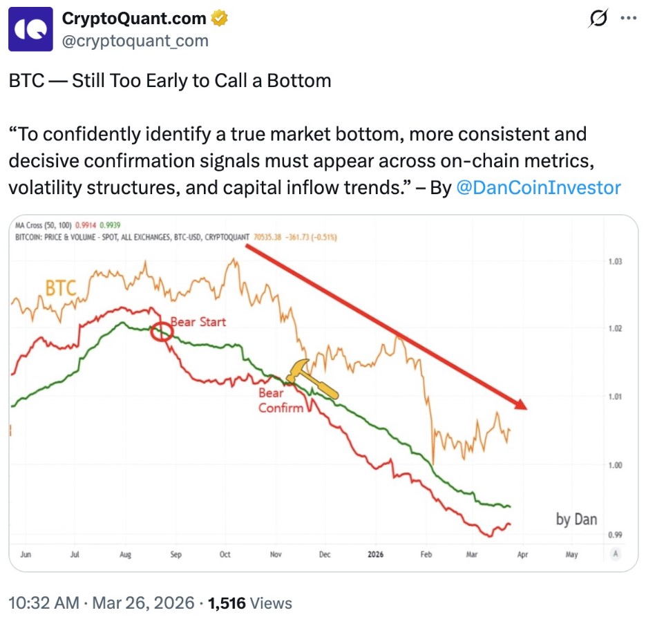 与此同时,CryptoQuant分析师Crypto Dan指出,虽然部分指标显示BTC/USD已在60000美元见底,“仍需更一致且更有力度的确认信号”以确定真正底部。