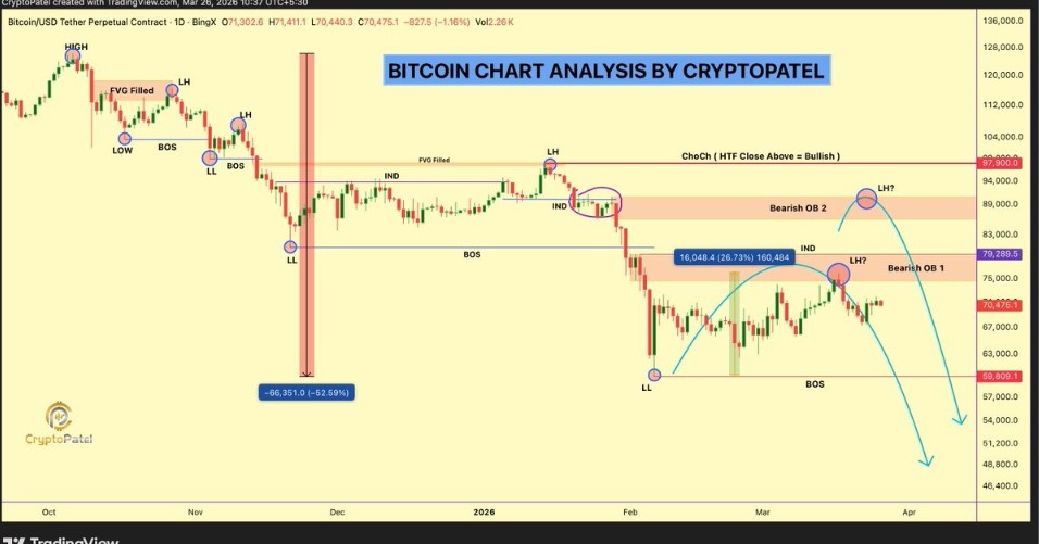 技术分析师CryptoPatel周四在X发文表示,比特币近期冲高至76000美元只是更低的高点,同时高时间框架结构指向“后续仍将下探”,下一个真正关注区间在50000美元下方。