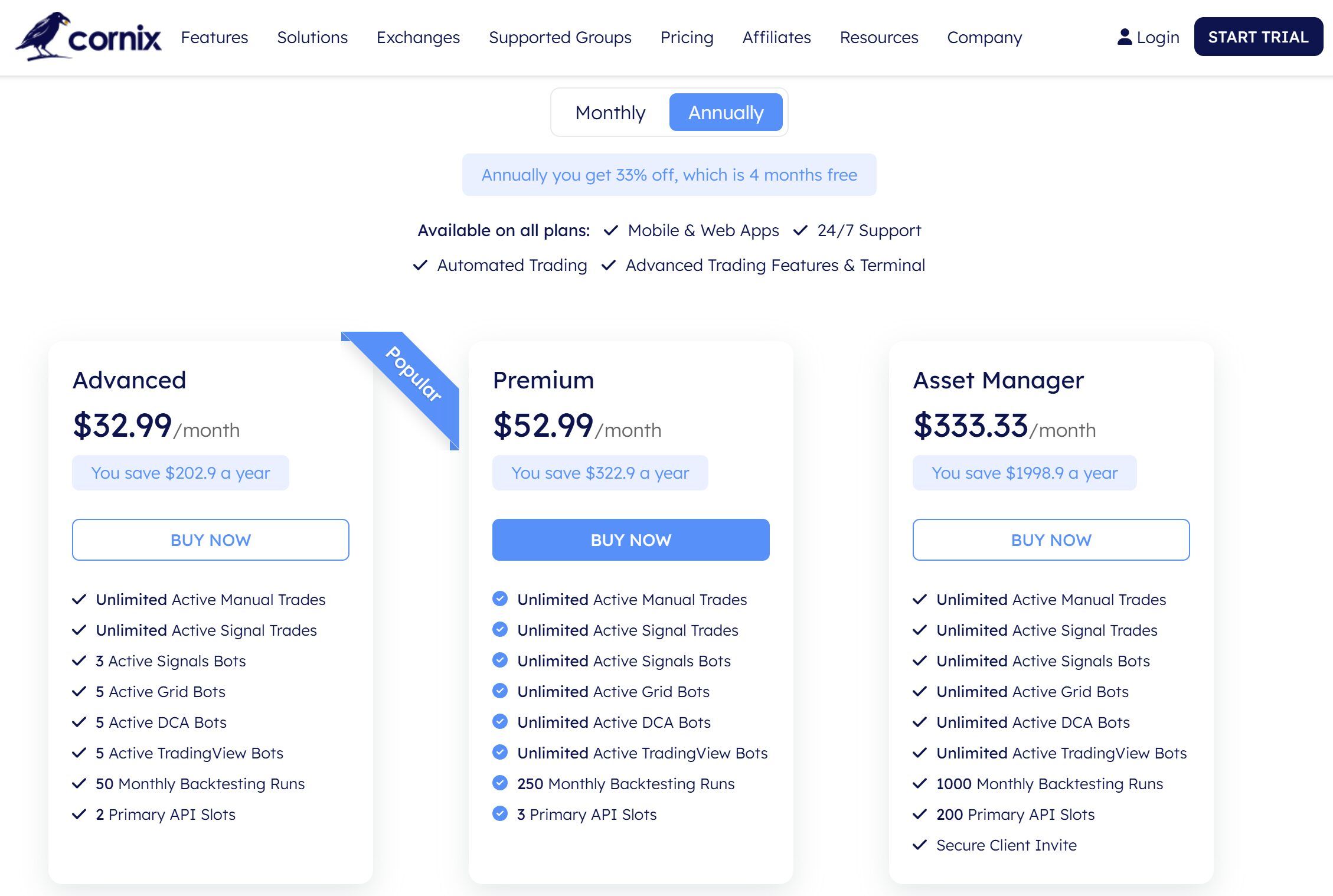 Cornix 采用订阅模式,提供高级版、尊享版和资产管理版等套餐,每个套餐都提供不同级别的自动交易机器人和高级功能访问权限。