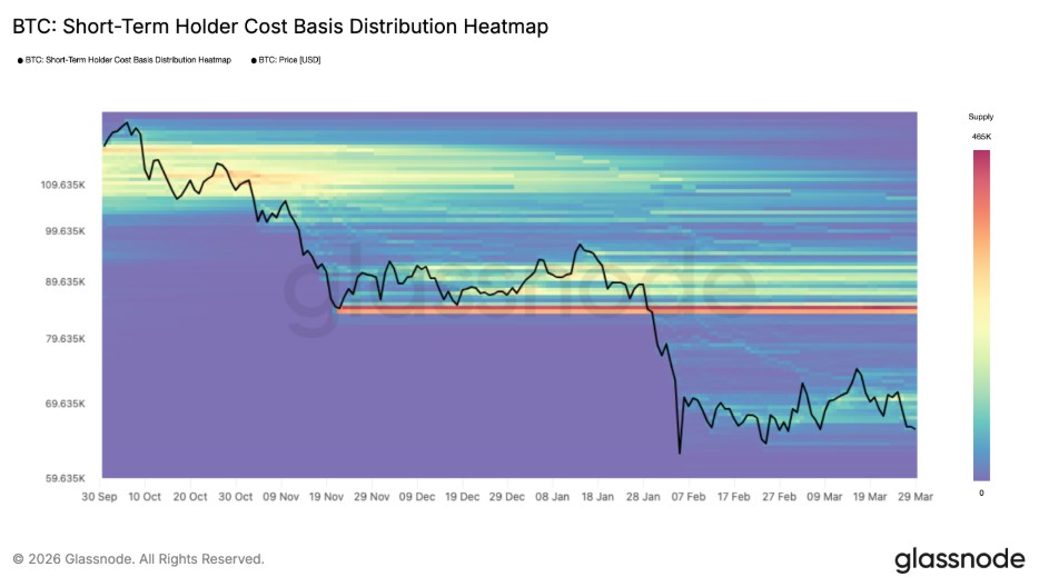比特币短期持有者成本基础分布热力图。来源:Glassnode
