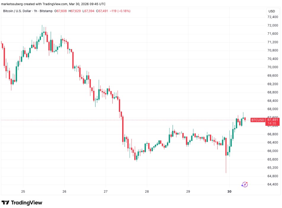 TradingView数据显示,67500美元成为周一关注焦点,而交易员对短期前景仍明显偏向规避风险。