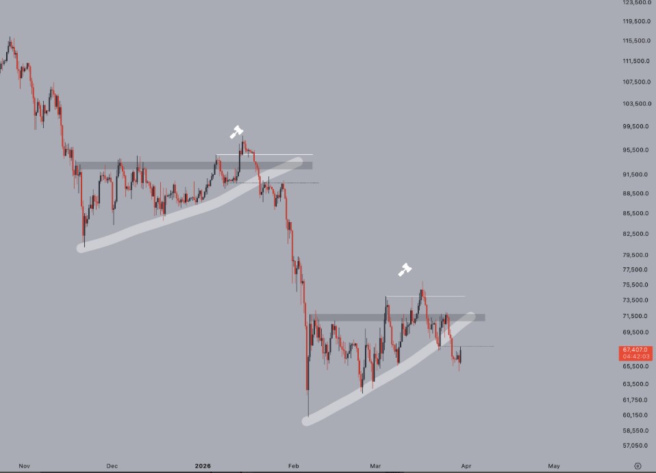 “如果4月早些时候跌入55000–60000美元区间,可能会形成一个很有吸引力的均值回归做多布局,恕我直言……(这很大程度上取决于整体宏观环境),”他们告诉X关注者。 “不过,在明确的上下文‘结构性’转变得到确认之前,更高时间框架的结构仍然占据主导。”