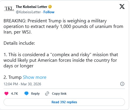 美国总统唐纳德·特朗普报告称,本周开局在军事层面迎来“重大一天”,此前有报道称美国正计划对伊朗发动地面入侵。