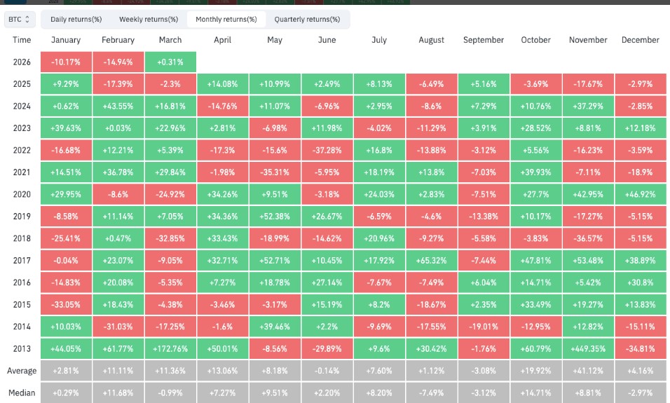 3月或将成为BTC价格第六个月收跌