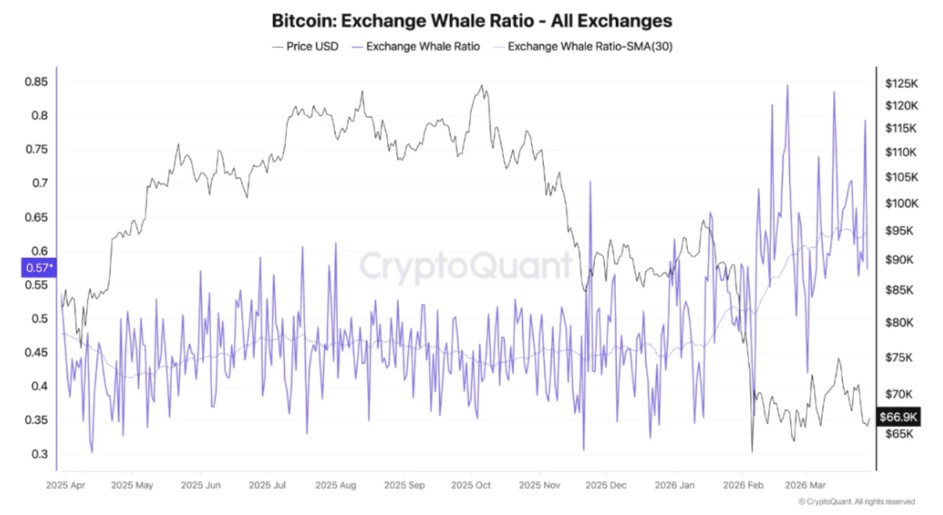CryptoQuant指出,流入交易所的资金中巨鲸占比正在上升,其钱包在最大规模入金交易中的占比更高。
