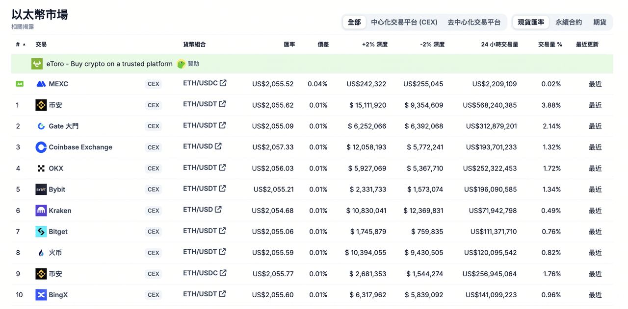 CoinGecko 在 ETH 币种页面的「市场(Markets)」分页中,汇整全球数百个交易所的 ETH/USD 与 ETH/USDT 即时报价,并同步显示 24 小时成交量、买卖差价(+2% 深度)以及最后更新时间。这让用户可以在单一页面直接比较不同平台之间的价格差异,例如快速对比 BingX、Kraken、Coinbase 等主流交易所,找出当下流动性较佳、价差较小的市场再进行交易。需要注意的是,CoinGecko 的报价为各交易所成交价的加权平均,更新频率约为 1~2 分钟,适合用于换币前的决策参考,但不适合依赖于秒级甚至毫秒级的高频交易判断。