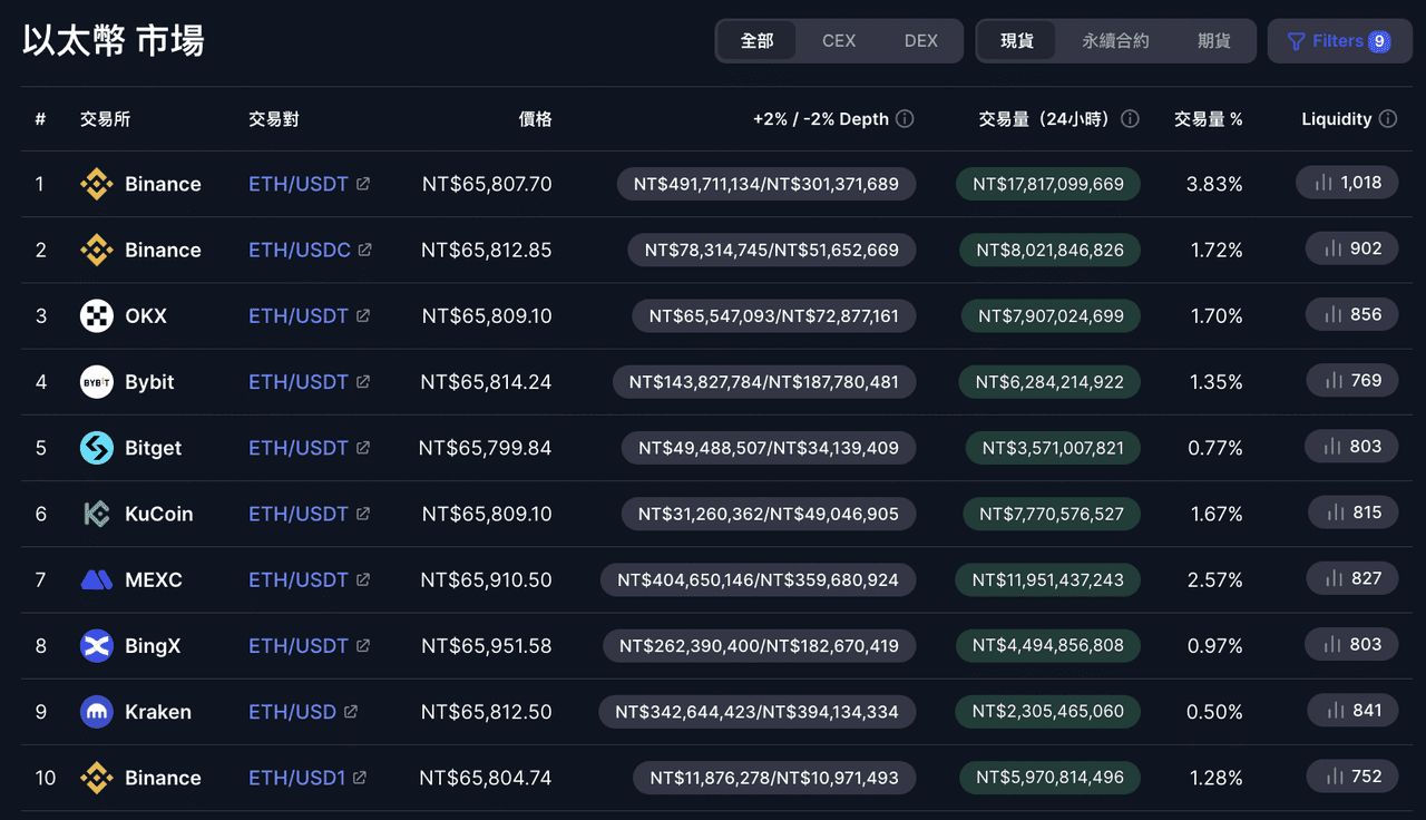 CoinMarketCap 同样在币种页面提供「市场(Markets)」分页,列出各大交易所的 ETH 即时报价与成交量信息,功能与 CoinGecko 类似,但在信息呈现上更偏向一般投资者的使用习惯。其一个重要特色是提供「流动性分数(Liquidity Score)」,用来评估各交易所报价的可信度,协助用户辨识哪些市场具有较高的实际交易深度,并降低受到虚假交易量或低流动性市场误导的风险。对多数用户而言,CoinMarketCap 可作为 CoinGecko 的补充工具,用于交叉验证价格与市场品质。