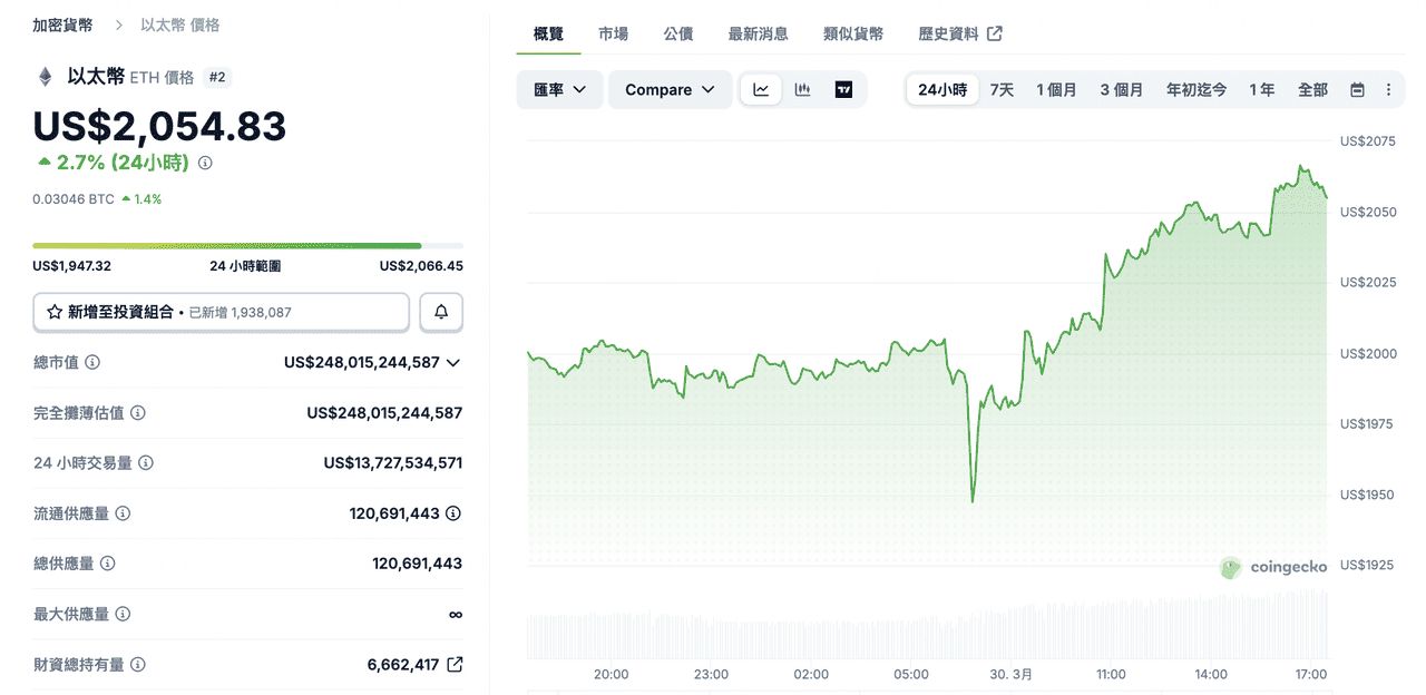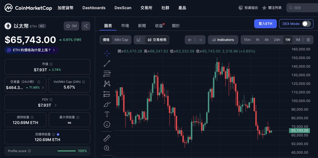 CoinGecko 的 ETH 币种页面是市场上最常用来确认「整体价格基准」的工具之一。相较于交易所提供的即时成交价,CoinGecko 的 ETH/USD 报价是以全球主要交易所的成交量加权计算,能更接近市场整体共识价格,而非单一平台的局部行情。在实际使用上,CoinGecko 更适合作为「换币前的价格参考」,用来判断当前交易所报价是否偏高或偏低,避免在不利价格成交。