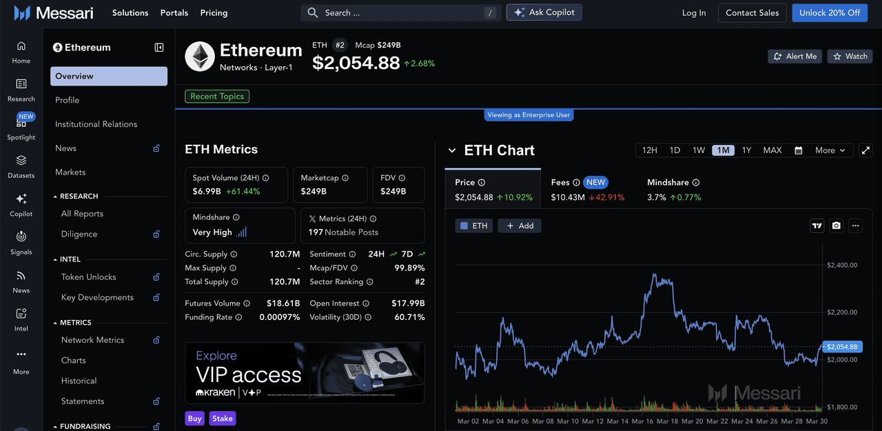 Messari 定位为机构级加密货币研究平台,在 ETH 价格追踪工具中属于高端选项。相较于一般工具只提供价格与成交数据,Messari 更着重于链上基本面与长期趋势分析,例如活跃地址数、交易笔数、网络手续费收入与质押比例等指针,让用户能从网络使用情况理解价格变动背后的结构性因素。这使得 Messari 更接近「研究工具」,而非即时行情工具,不过 Messari 目前只提供英文版界面,对繁体中文用户来说进入门槛比较大。