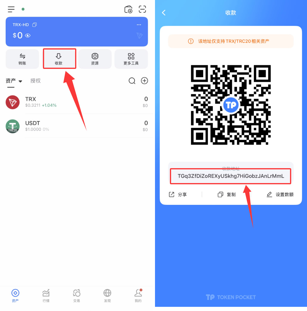 2、在TP钱包中切换到比特币网络,点击「收款」,查看首款地址,对比两个地址是否完全相同。