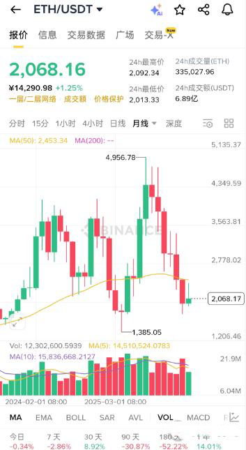 根据以太坊3月月线走势,我们从均线、K线形态、成交量三个维度拆解当前月线走势的核心特点: