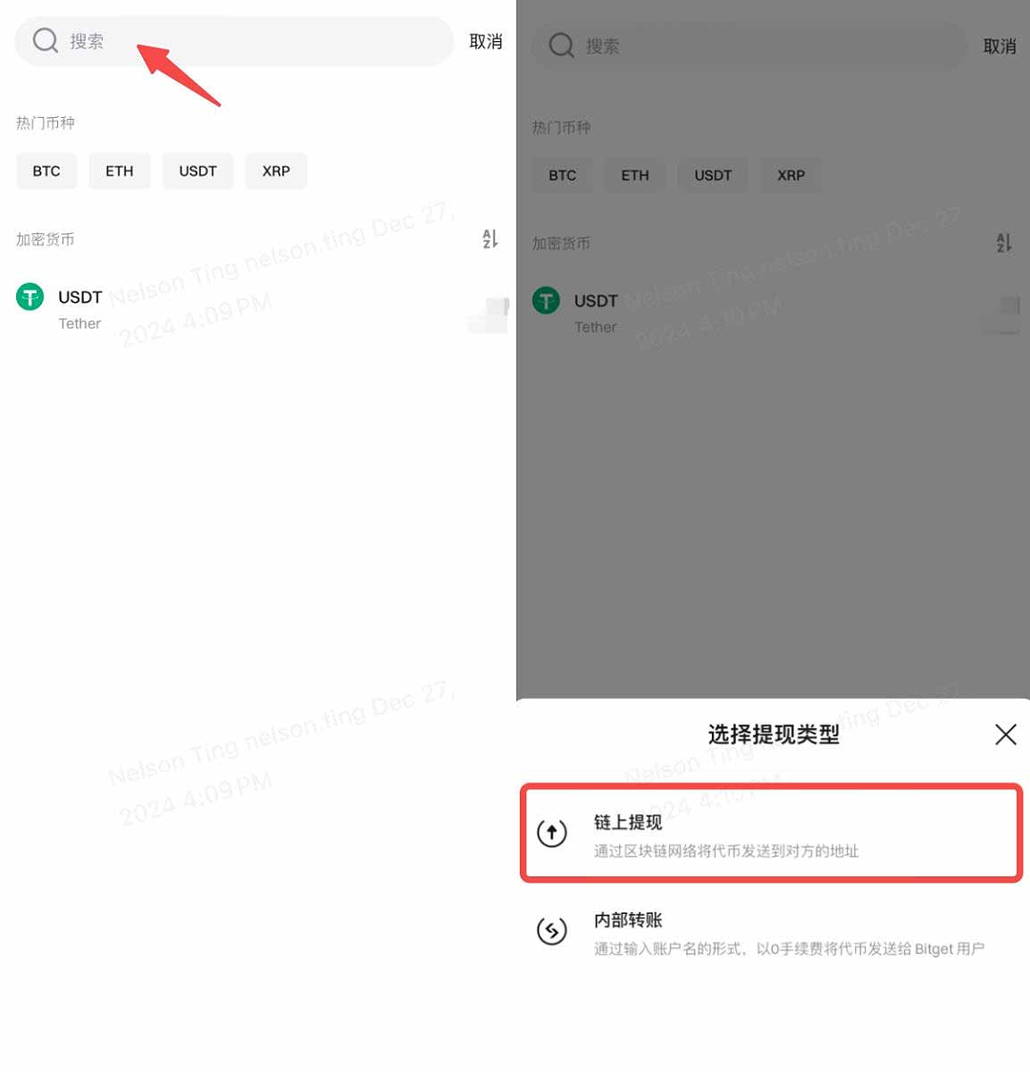 - 1. 使用搜索栏查找要提现的加密货币。