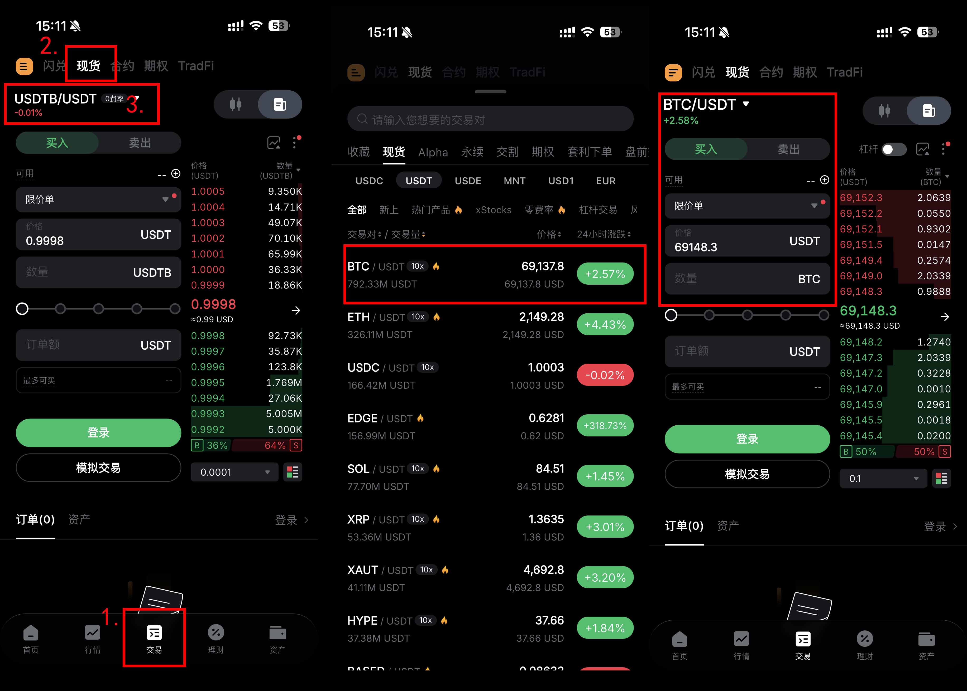 入金完成后,最简单的开始方式是做一笔现货交易——直接买币。