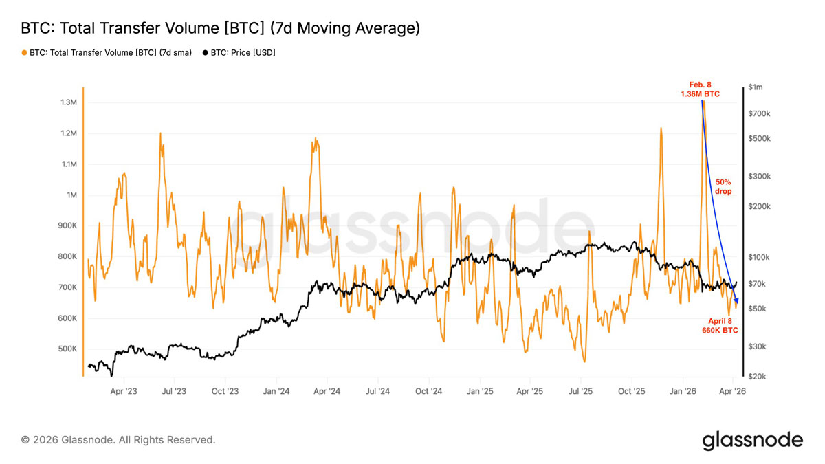 链上转账交易量的七天移动平均已从不到 30 天前的 136 万 BTC 下降约 50.5%,至 66 万 BTC,时间已达周四。