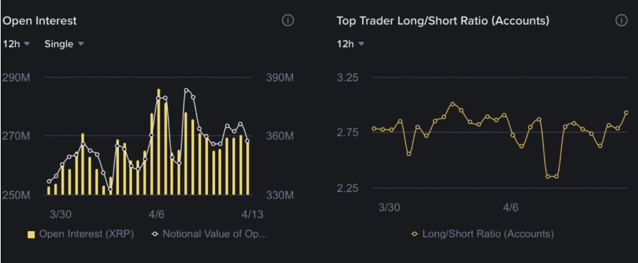 XRP 长期头寸数据来自Binance,显示顶级交易者的多空比率为2.75 —— 这意味着在平台上最有经验的交易者中,每一个空头头寸都有2.75 个多头头寸。