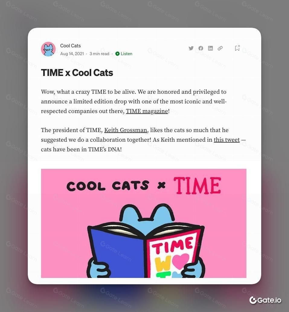 在这一时期内,Cool Cats 还和《时代》杂志达成合作,共同发布了限量版 NFT,基于 Cool Cats 的四位创始人而设计,每位创始人各有一只,总共包含 100 个不同的 NFT 形象。这 400 个 NFT 作为社区中创作比赛的奖励,其中 8 位最佳创作者各获得其中一个 NFT。剩余的 392 个 NFT 也随机分配给了参赛的 392 位用户,《时代》杂志总裁 Keith Grossman 也在 Twitter 上对 Cool Cats 表达了赞赏之意。