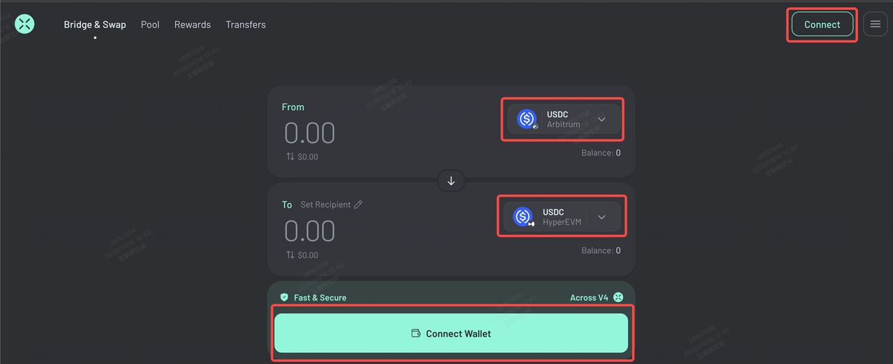 连接到Across Protocol:一旦您的资产到达您的钱包,导航到Across Protocol dApp。点击连接钱包并选择Rabby钱包或您首选的EVM兼容提供商。