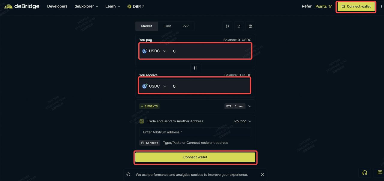 - 连接到deBridge:访问deBridge dApp并选择Solana作为您的源链,Hyperliquid作为您的目标。