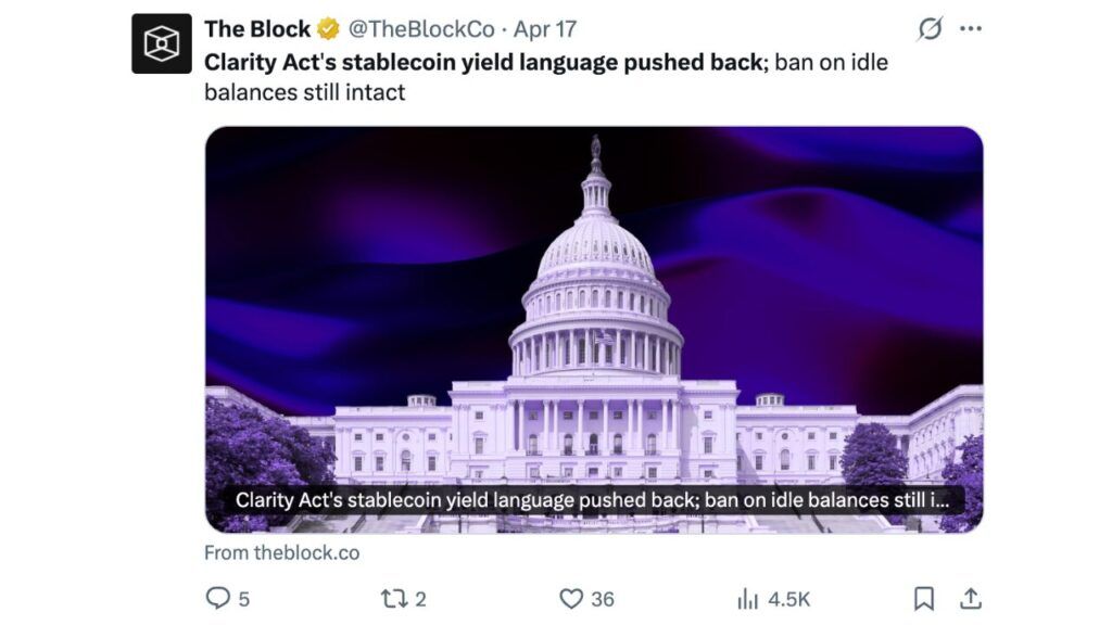 由于银行和加密货币行业之间就稳定币收益率存在争议,《CLARITY法案》被推迟。