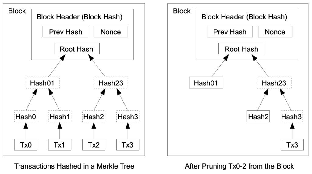 剪枝节点中的压缩区块,实际上是这些区块的数据的 “哈希值”(摘要)。因为它们的体积更小,压缩区块减少了运行剪枝节点所需的存储空间。在验证过程中,这些区块摘要也是可以依靠的,因为如果输入的数据与真正的区块不符,其哈希值也会不同,立即就能被检测出来。