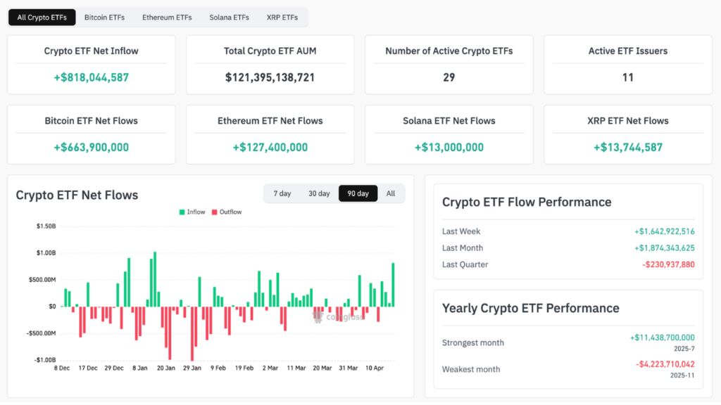 最新数据显示,比特币ETF继续引领资金流入,吸引了约6.639亿美元的资金,而同期以太坊ETF则吸引了约1.274亿美元的资金。总体而言,加密货币ETF的总流入量约为8.18亿美元,凸显了机构投资者对该资产类别的持续需求。