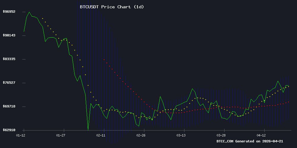 BTC 目前交易价格为76,618.18 USDT,显着高于 20 日移动平均线 (72406.10),表明短期内上涨势头强劲。MACD 指标仍处于负值区域 (-3914.06),但信号线 (-3124.99) 正在收敛,提示抛售动能正在减弱,可能出现反转。价格目前接近布尔带上轨 (78734.83),这通常表明超买状态,但在强劲的市场中,价格可以在布尔带内波动,从而维持上涨趋势。直接支撑位在布尔带中轨 (72406.10),其次是布尔带下轨 (66077.37)。