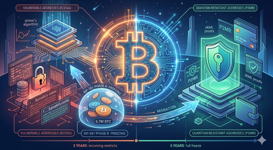 BIP-361 代表比特币为应对量子计算威胁所做出的最严肃尝试。该提案将冻结约 670 万枚比特币于易受攻击的地址中——价值约 750 亿美元——除非持有者在五年内迁移至抗量子地址。这不是理论上的讨论,而是一项紧急的安全升级。