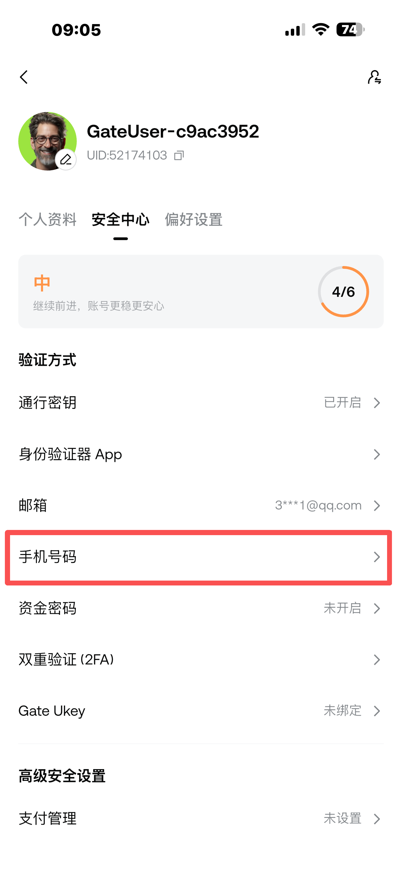 1.打开Gate.io APP,点击左上角头像图标,进入新界面,点击头像位置进入个人中心,选择安全中心,点击手机号码,如图