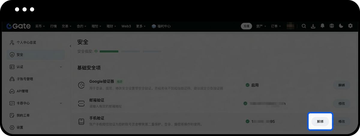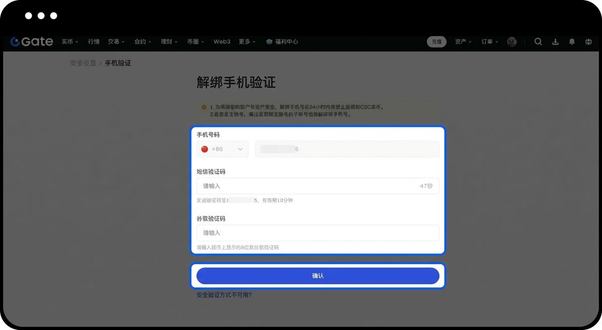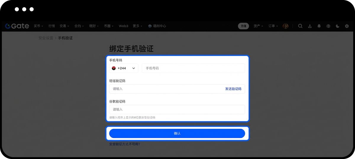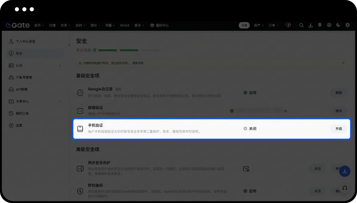 Gate.io 绑定手机号,核心前提:先绑定邮箱 / 已开启 2FA(谷歌验证),绑定后有24 小时保护期,期间无法提币、法币交易。