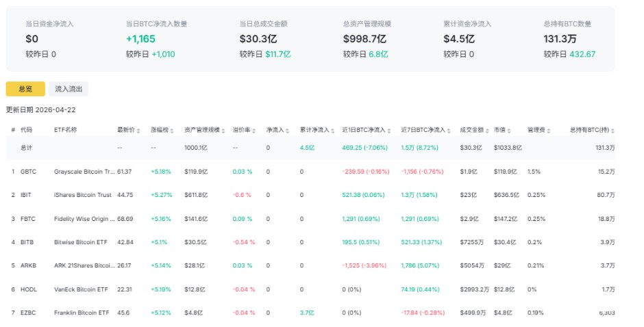 截至4月23日,美国比特币现货ETF总资产净值已达990.81亿美元,历史累计净流入约579.90亿美元。 4月22日单日净流入3.319亿美元,其中贝莱德IBIT以2.469亿美元领跑,占当日总流入约74%。 这已是ETF连续第6个交易日录得净流入,其中4月17日单日净流入高达6.6391亿美元,创近期最高。