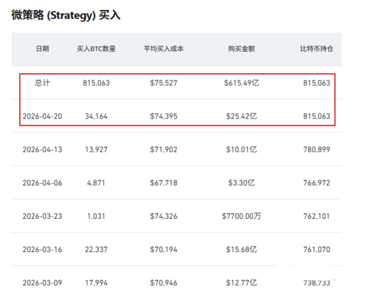 我们看到,企业级买家正以ETF难以企及的速度扫货。 4月13日至19日这一周,Strategy斥资约25.4亿美元,以均价约74,395美元购入34,164枚比特币,单周增持规模位列公司历史上第三位。 截至4月19日收盘,Strategy钱包地址共持有815,061枚BTC,累计投入约615.6亿美元,平均成本75,527美元/枚,持仓占比特币总供应量约3.88%。