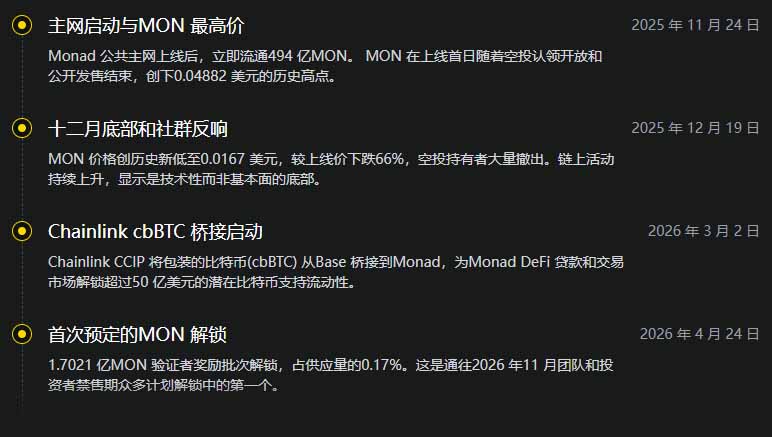 从 2025 年 11 月主网启动到 2026 年比特币流动性迁移,塑造 Monad 的关键事件。