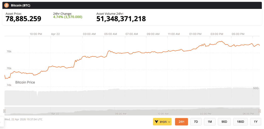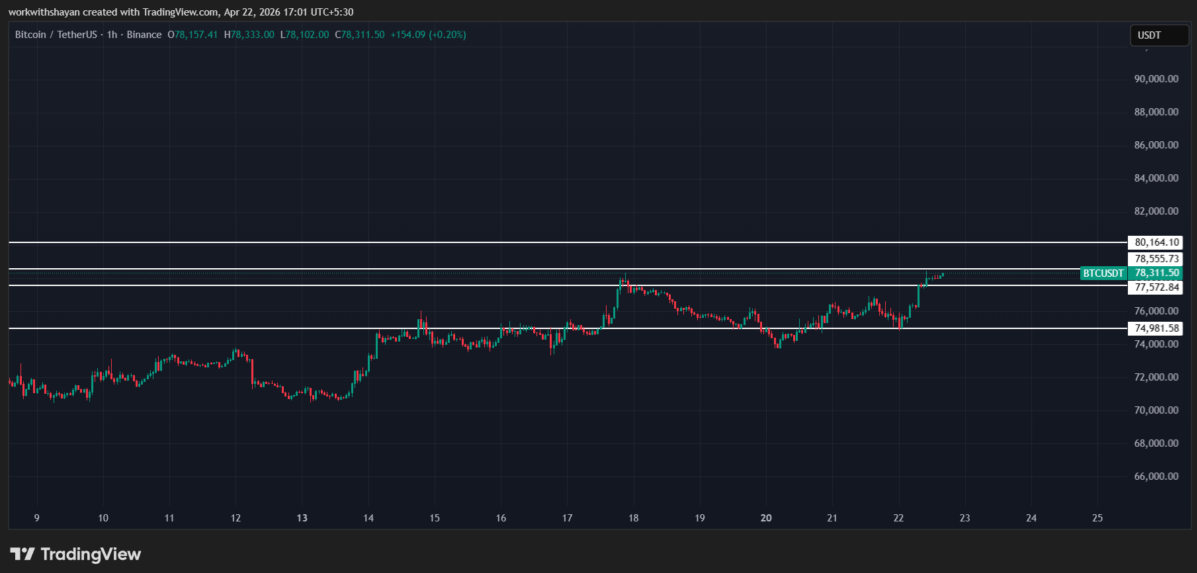 4月22日的比特币价格分析证实,随着比特币价格飙升至7.8万美元附近,买盘压力增大。目前, Bitcoin 价格的目标是守住8万美元上方。