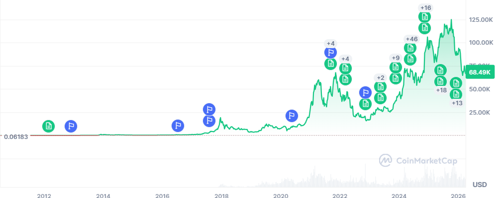 - 2021 年, Bitcoin 达到峰值 68,789.63 美元,但在通货膨胀和地缘政治冲突等经济压力下,到 2022 年 12 月跌至 15,760 美元。