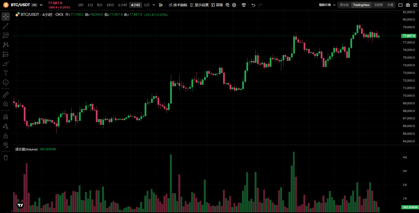 截至周四,根据Brave New Coin市场数据,比特币交易价格接近78,100美元,市值约为1.56万亿美元,24小时交易量超过380亿美元。这使得比特币价格较2月下旬的低点大幅上涨,并重回此前买家、ETF资金流动和衍生品仓位等因素共同发挥作用的区域附近。