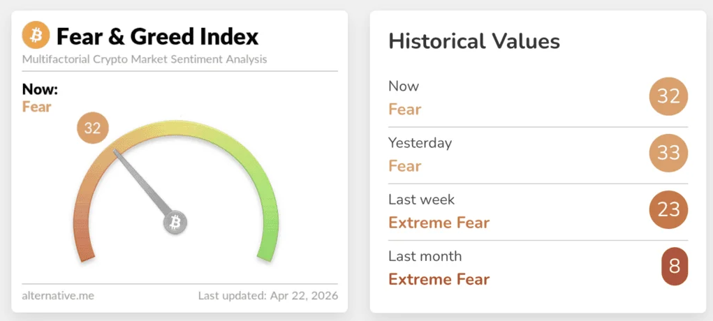 与此同时,市场情绪开始回暖。比特币目前的结构——短期持有者亏损严重、200日移动平均线高企、资金持续亏损——与2022年中期上一轮熊市第二轮行情之前的状况如出一辙。 加密恐惧与贪婪指数一周前,该指数显示极度恐慌,为 23,如今已几乎翻了三倍,达到 32,但仍处于“恐慌”区间内,未达到中性阈值 40。