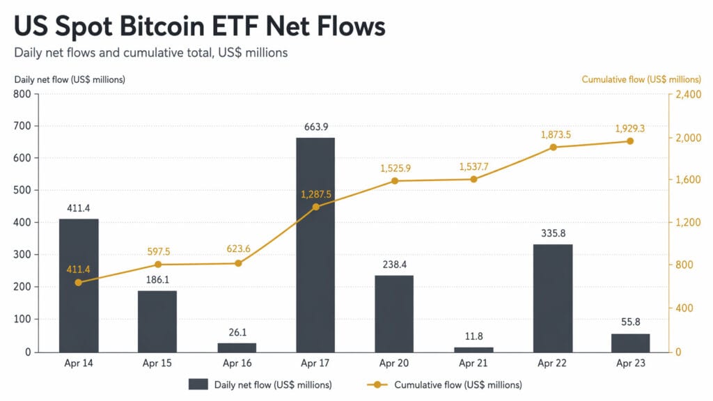 比特币反弹最明显的支撑来自交易所交易基金(ETF)需求的回归。美国现货比特币ETF在经历了早前的低迷期后,已恢复持续的资金流入。Farside Investors的数据显示,4月14日至23日期间,每日净流入均为正值。在此期间,这些产品共吸纳了约1.93亿美元的资金,其中贝莱德旗下的IBIT领涨,并得到了整个ETF市场更广泛参与的支撑。