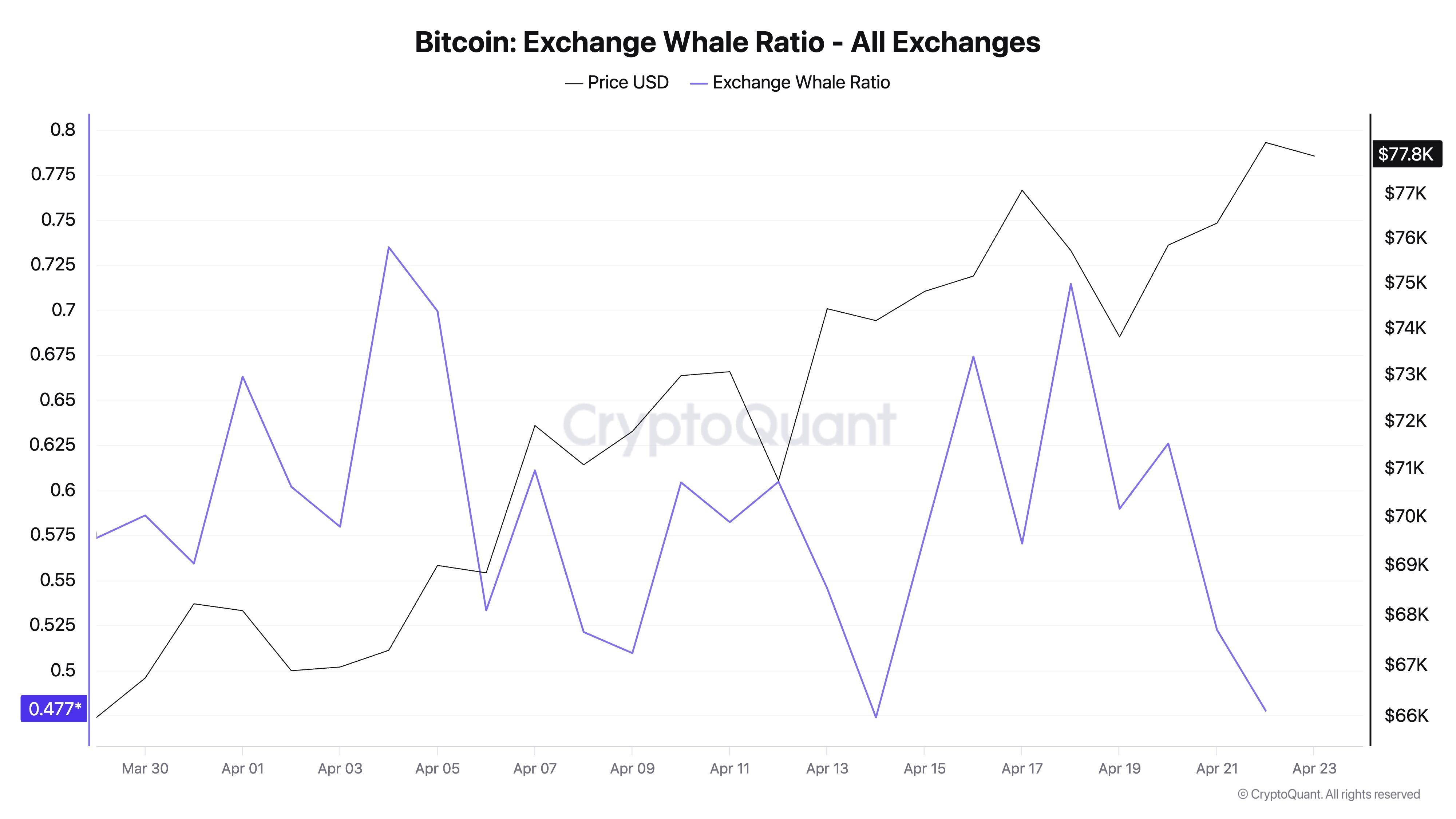 从3月下旬到4月中旬,该指数在0.5至0.7之间波动,有时甚至与价格同步上涨。然而,近几日鲸鱼比率已降至0.48左右,表明大规模资金尚未重返交易所。