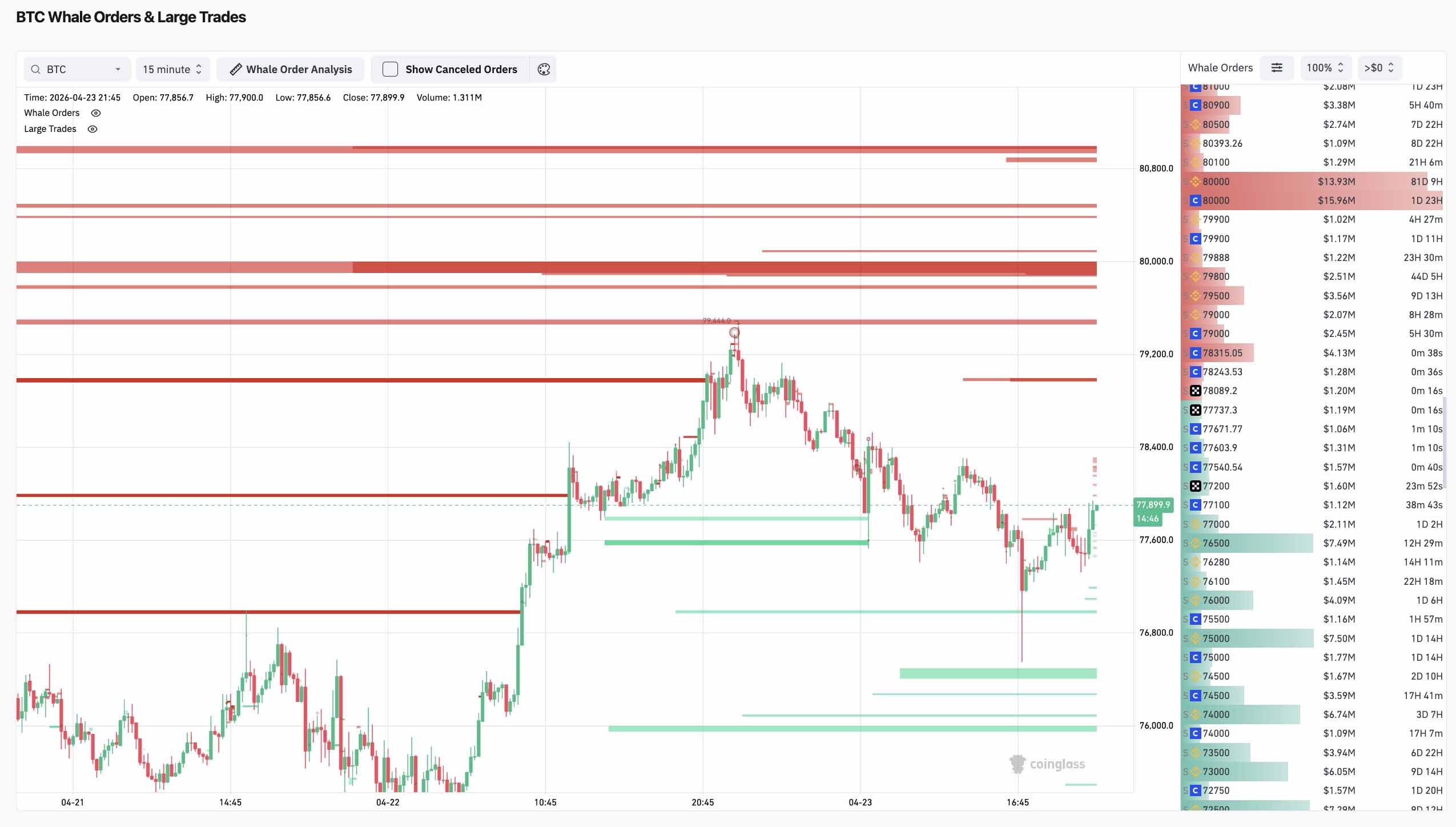 Coinglass的数据显示,当前价格两侧都存在大量流动性聚集。上方,79,000美元至81,000美元区间的密集卖盘构成了一道明显的阻力层。下方,75,000美元至76,000美元附近集中了大量买盘,形成了一个短期支撑区域。