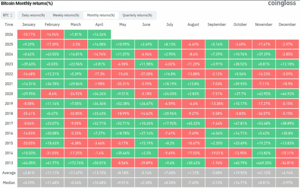 CoinGlass显示,如果本月收盘价与当前水平持平,该货币对将创下自2024年11月以来表现最看涨的一个月。目前,今年4月的涨幅略高于2025年的同期涨幅,当时比特币全年上涨了14.1%。