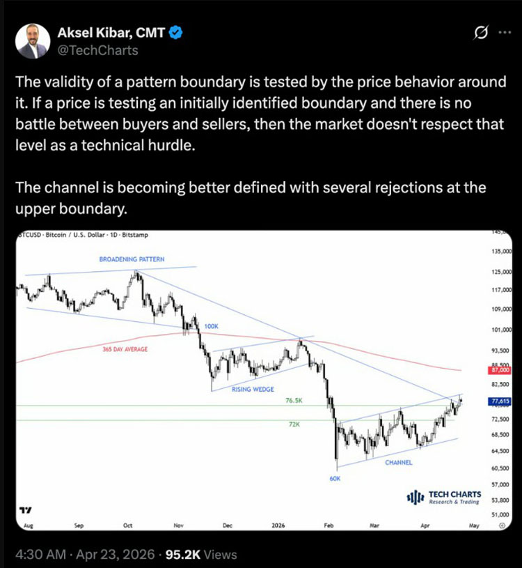 比特币/美元涨至关键阻力位。来源:阿克塞尔·基巴尔 / X