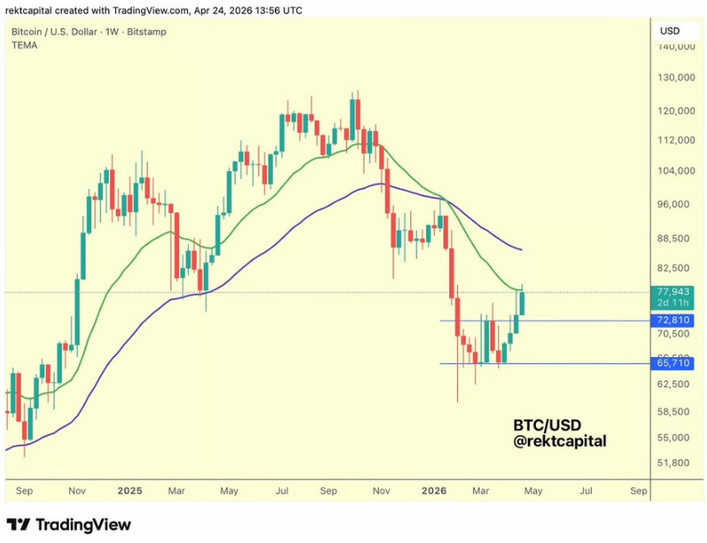交易员兼分析师Rekt Capital评论称,若持续在21周EMA处遭到拒绝,将导致价格反转并重新测试局部低点。