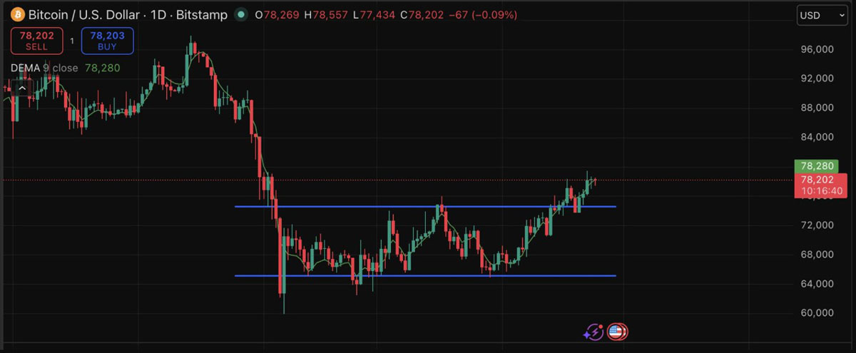 比特币每月上涨10%,达到当前77,800美元,标志着本季度早些时候地缘政治紧张局势带来的压力后实现了显著反弹,分析师追踪68,000美元左右的关键支撑区间,作为任何持续反弹论点所需的底线。
