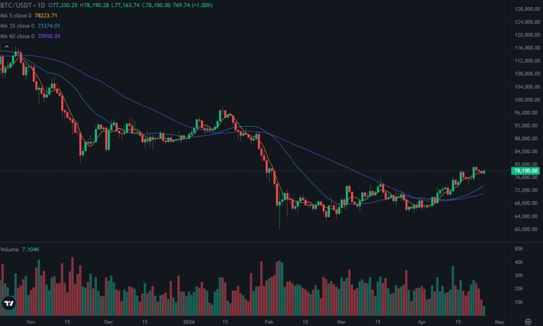 BTC 现在的交易价格约为$78,100,之前短暂下滑至$78,190。