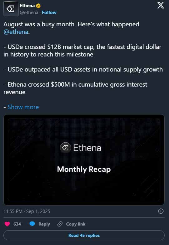 一项治理提案旨在将协议收益分配给ENA 质押者。大部分里程碑已达成;启动待USDe 供应量回升至超过100 亿美元。