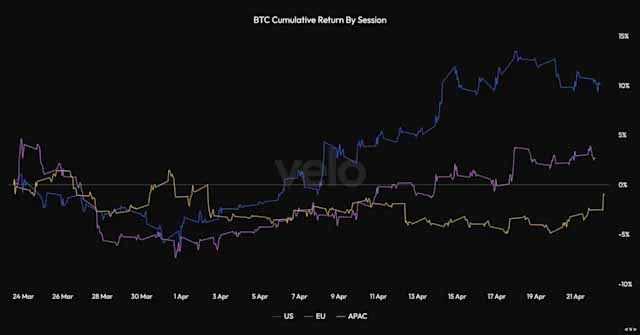然而,这仍然无法完全解释交易记录本身。截至4月19日当周, Strategy的25.4亿美元买入规模超过了ETF的净流入,这印证了更准确的观点:并非“ETF缺席”,而是ETF和Strategy都在买入。Strategy的买入规模之大,足以成为市场上最重要的边际买入之一,这也与交易时段图表相吻合。几乎所有收益都发生在美股交易时段,而美国最大的买家之一投入了25.4亿美元,Strategy对BTC价格的影响不容小觑。