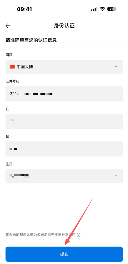 4.选择国籍-输入身份证号码-以及姓名,点击提交,如图