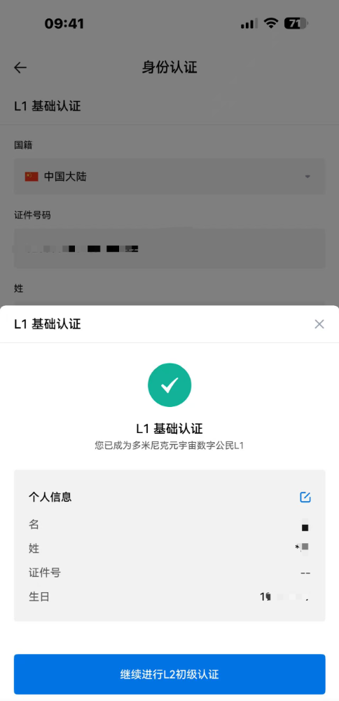 5.L1认证完成,大家可以继续进行L2认证或者点击X号结束认证,如图