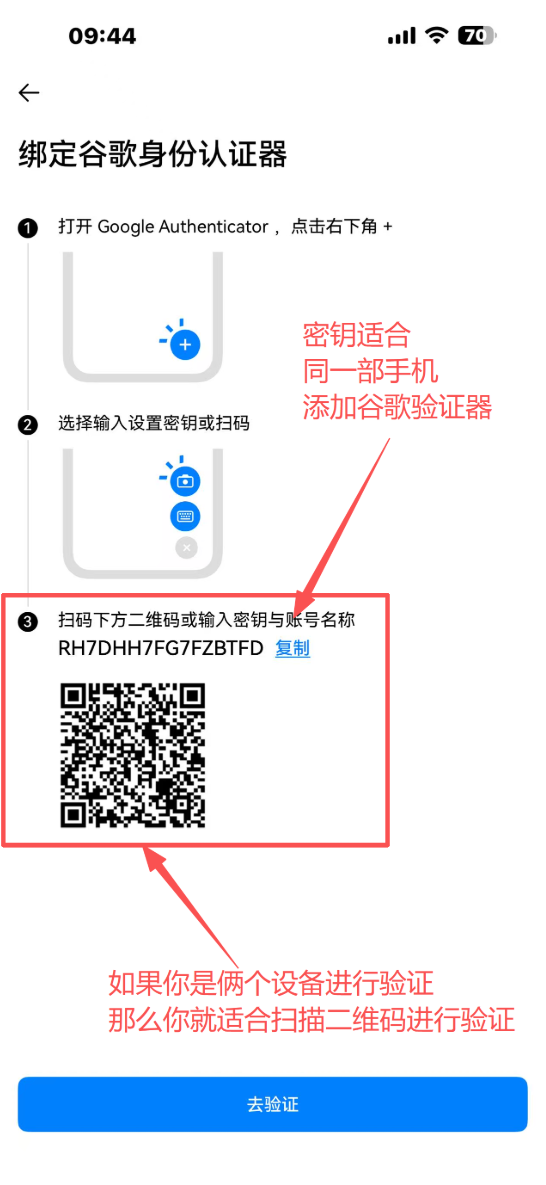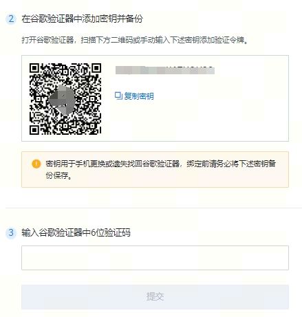 2.点击复制密钥或者扫描二维码,如图